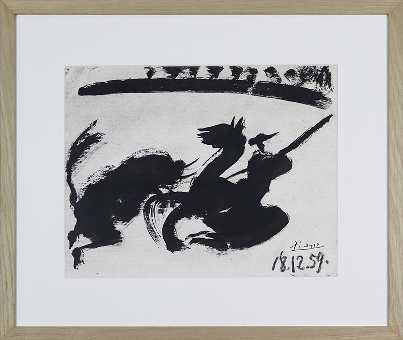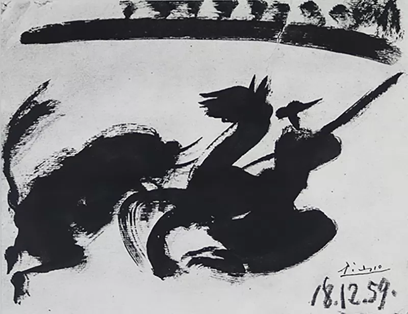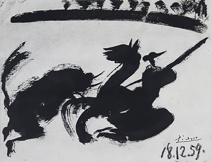 Nota: em 1961, Pablo Picasso publicou um livro de arte, repleto de ilustrações e gravuras, dedicado à arte da tauromaquia, intitulado “Los Toros”. Este trabalho é uma das lindíssimas ilustrações insertas neste “Los Toros”, um livro raro e valorizado no mercado internacional de arte.