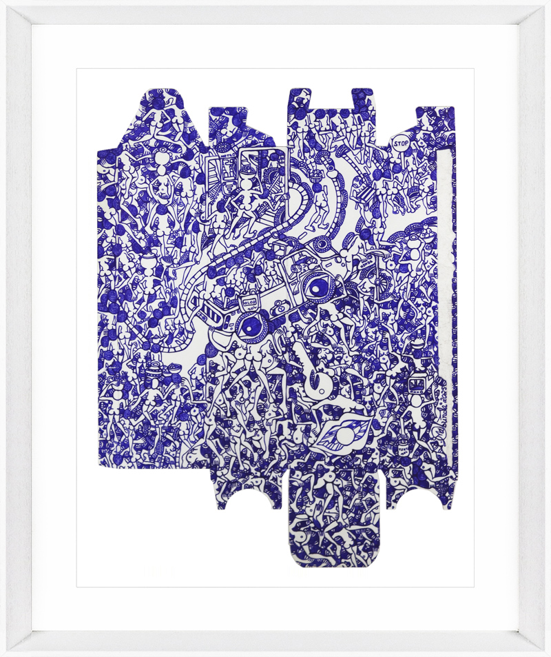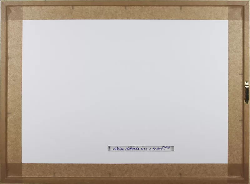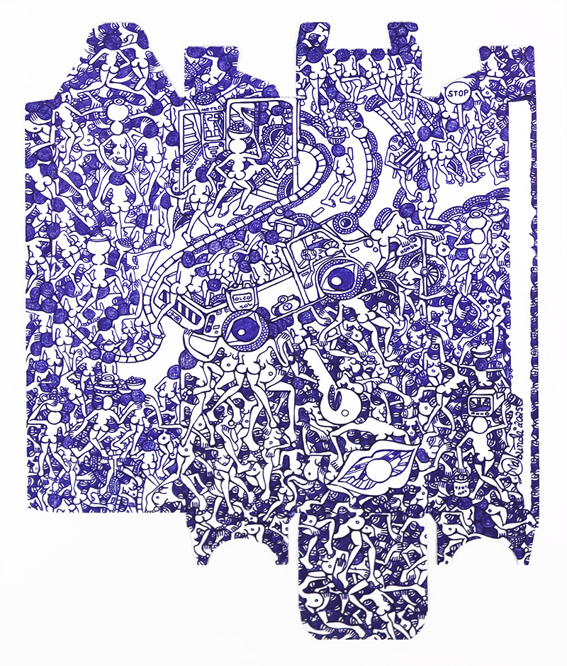 Com o tempo, Rodrigo criou uma linguagem visual própria. Os seus desenhos, feitos a esferográfica sobre caixas de cartão, revelam narrativas densas e caóticas, cheias de figuras que se cruzam e se contorcem. Estas composições refletem o quotidiano moçambicano: festas, mercados, cerimónias e ruas sempre cheias de movimento. O artista descreve-se como “um sonhador das ruas”, alguém que percorre a cidade para recolher histórias e atmosferas. Além disso, não planeia os desenhos. Segundo ele, “a caixa dá-me o movimento; o formato ajuda-me a desenhar”.